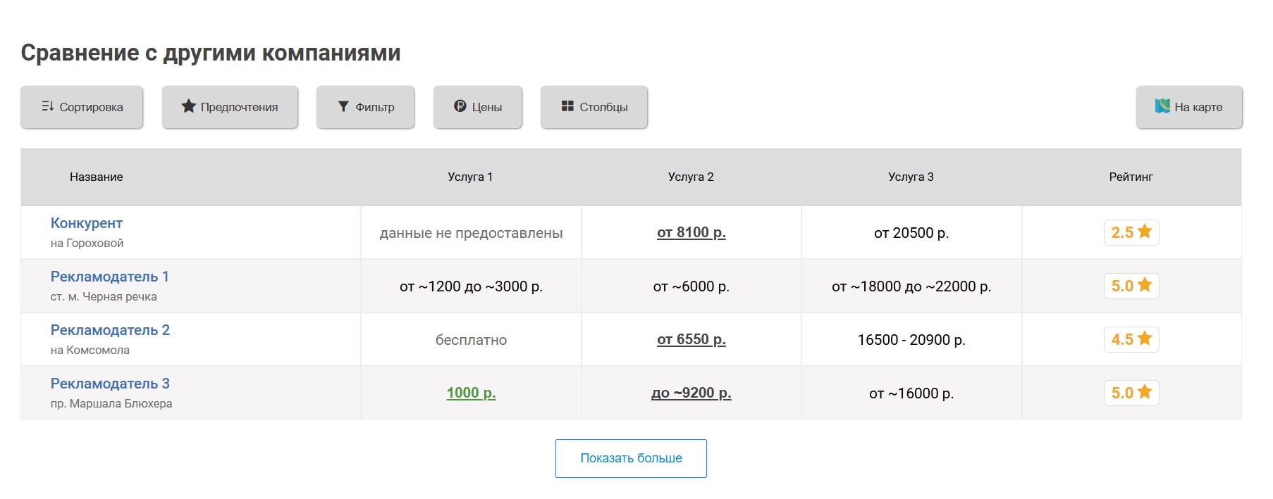 антикафе, продвигаемое антикафе попадёт к ним в таблицу «Сравнение по ценам», которая выглядит следующим образом: